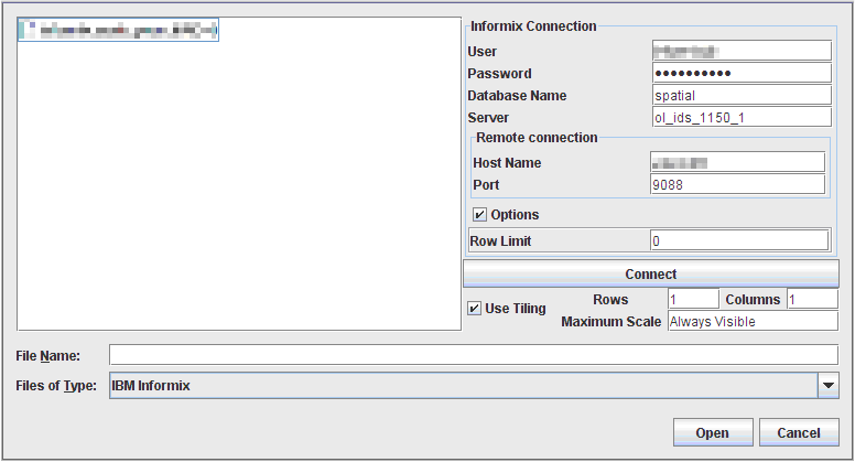 If the data source is an Informix®spatial database, there are specific parameters that you can set. The following figure shows the options available when importing from an Informix spatial database.