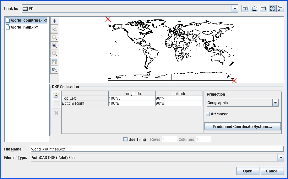 button. This adds two columns: Pixel Column and Pixel Line. In this mode you can set the position of the image manually using the pixel properties or the latitude\longitude properties. In addition, you can drag the red crosses to the point you want; this automatically sets the property values in the DXF Calibration pane. The red cross associated with a selected row is contained in a rectangle.