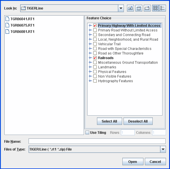 In the Feature Choice pane, click each of the features you want to display in the TIGER/Line data source. Note that you can expand a feature and select one or more of its subfeatures.