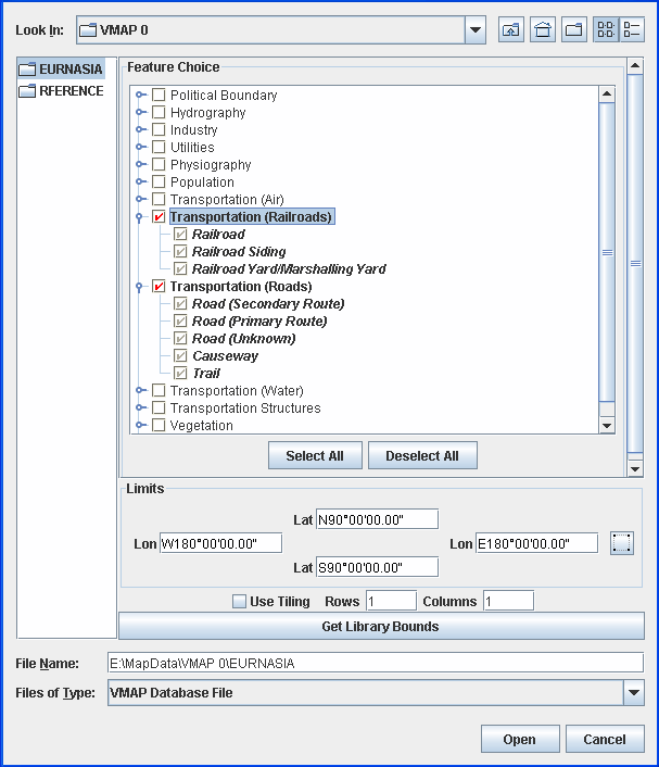 In the Feature Choice pane, click each of the features you want to display in the VMAP data source. Note that you can expand a feature and select one or more of its subfeatures.