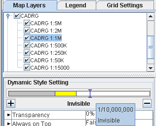 If you have a multiresolution map, for example, a CADRG, the different resolutions are displayed in the Map Layers pane as sublayers. When a sublayer is selected, a bar is displayed in the Dynamic Style Setting pane, and the name of the style is displayed for each section of the bar. You can also use this bar to set the map scale with a single click. This enables you to preview the map appearance at the selected scale.