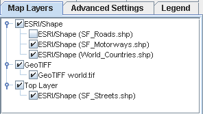 In the following figure, the ESRI/Shape (see Shapefile format) and GeoTIFF (see GeoTIFF format) files are grouped as sublayers under their parent layers. The last layer in the hierarchy becomes the front layer in the Map View pane. For example, the Labels layer is displayed in front of the GeoTIFF layer in the Map View pane.