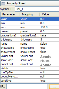 The class IlvDashboardPropertyPanel contains a Swing JTable that displays the properties of objects selected in the diagram. Use the property sheet to view and edit the properties of a background object or the parameters of a symbol.