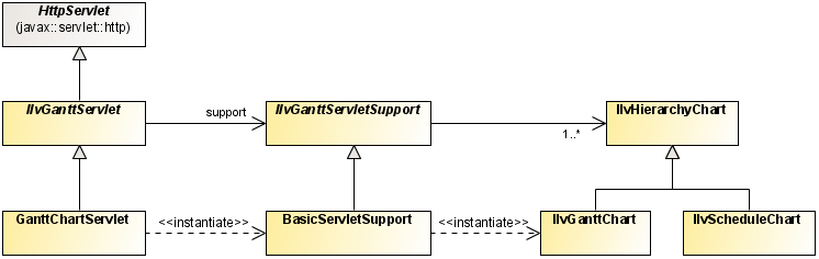 The blue classes are members of the JViews Gantt API. The abstract classes IlvGanttServlet and IlvGanttServletSupport belong to the ilog.views.gantt.servlet package. IlvGanttServlet is an abstract servlet that responds to HTTP requests to generate images of a Gantt chart or a Schedule chart. IlvGanttServlet is a very simple class that delegates all its real work to an instance of IlvGanttServletSupport. This allows you to easily integrate the full capabilities of the Gantt server-side classes into your own servlet implementations.