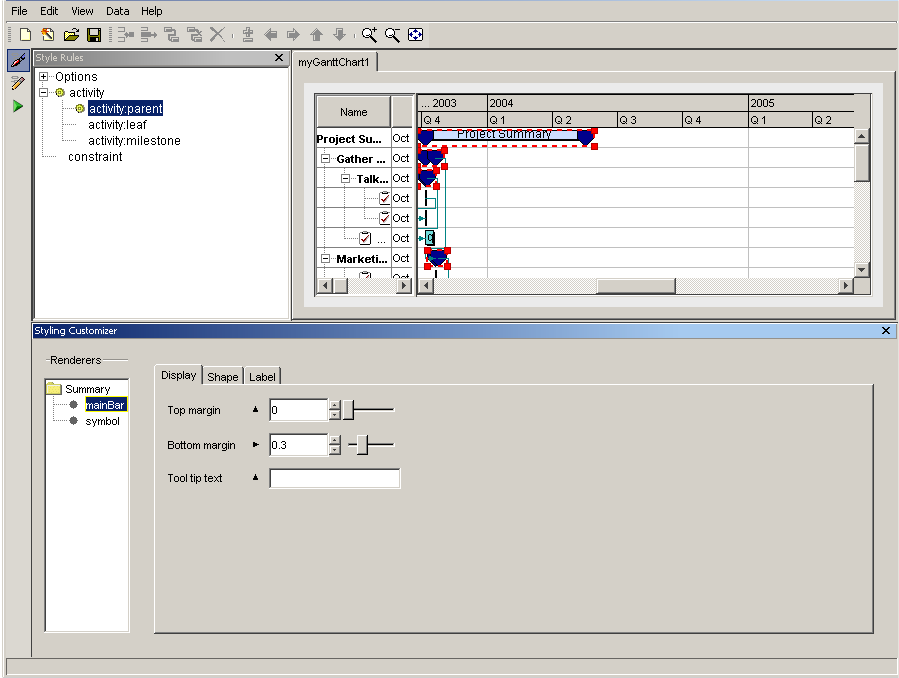 JViews Gantt lets you develop the charts completely in the GUI. A chart component can even be integrated as a JavaBean into a third-party IDE, so that you can continue to develop within your preferred environment, but using the appropriate parts of the Designer to develop the chart components.
