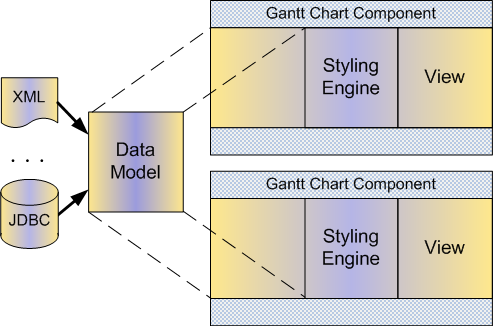 JViews Gantt makes use of a powerful Swing-like MVC architecture. MVC architecture means that there is a clear separation between data and display, consistent with Swing Java® user interface. The data model is open and extensible, as opposed to other types of closed architecture.