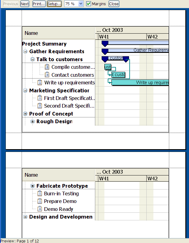The following figure shows the print preview of a multipage document in JViews Gantt.