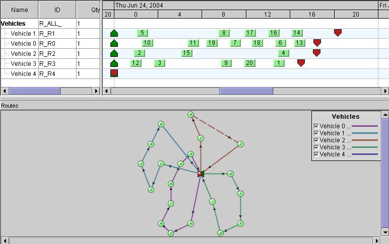The following figure shows the use of JViews Gantt with JViews Maps to visualize a vehicle dispatching system implemented in Dispatcher.