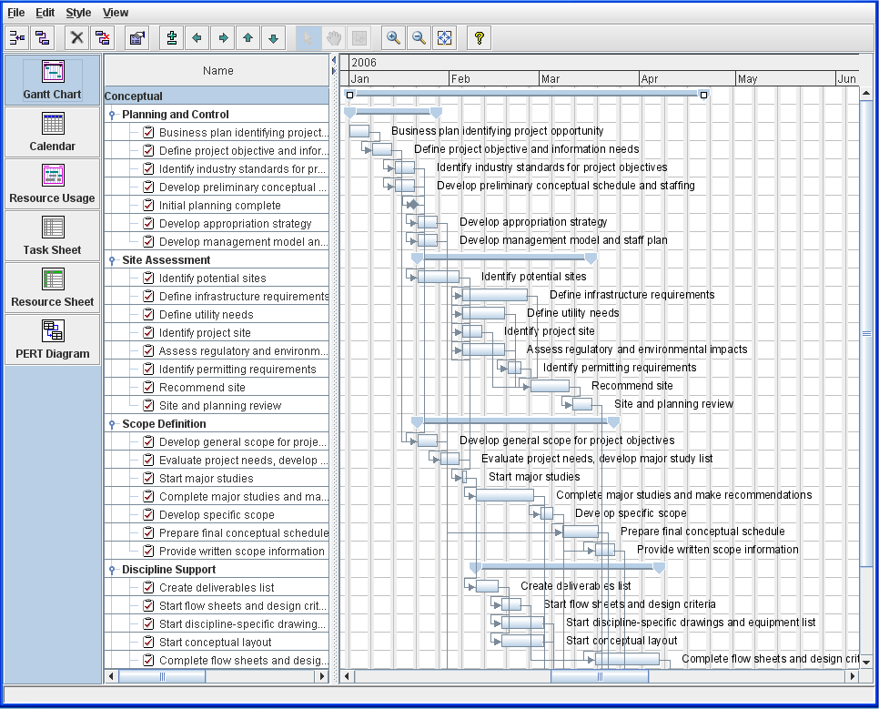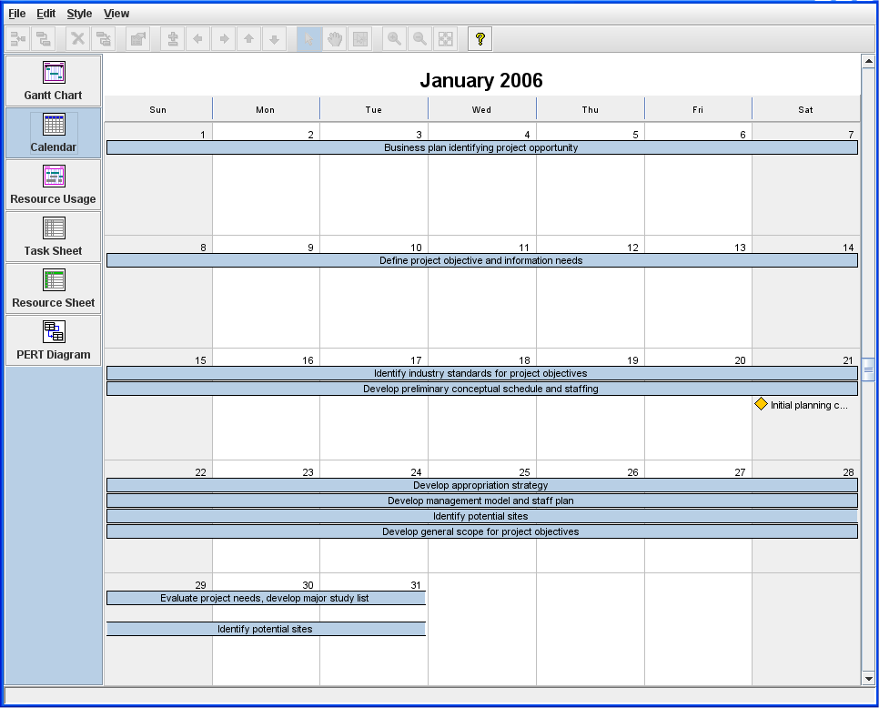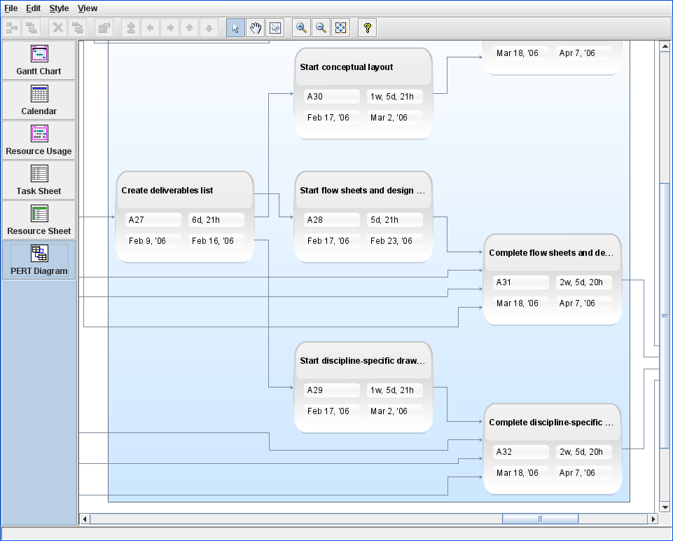 This sample has a PERT view that is only visible if JViews Diagrammer is also installed (as a purchased product or as an evaluation). If JViews Diagrammer is installed, the sample will show a PERT chart diagram view of the data in the Gantt data model.