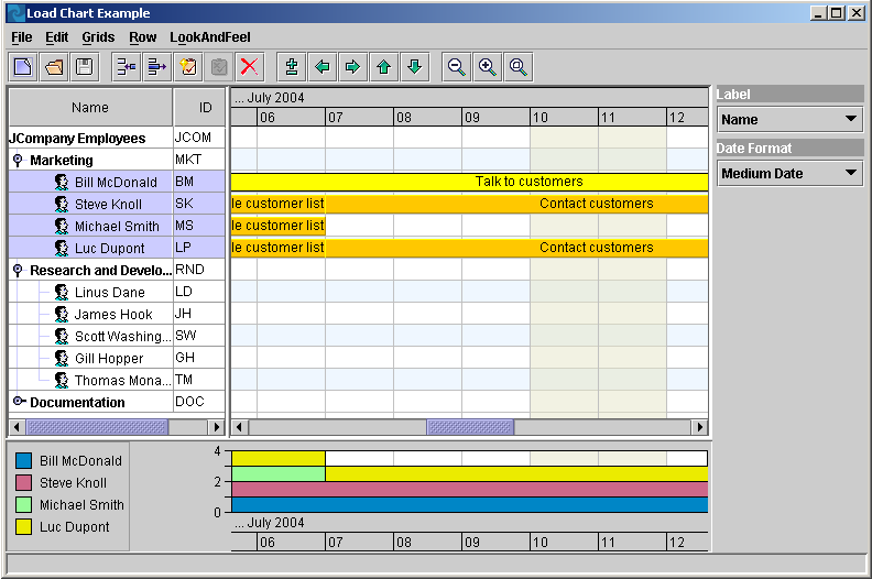 The following figure shows a resource-based Gantt chart with Resource Data chart from the Gantt Viewer sample.