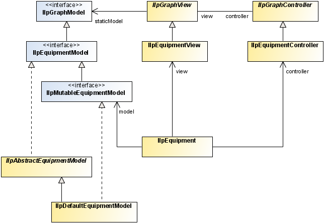 The model interfaces are IlpEquipmentModel and IlpMutableEquipmentModel. IlpMutableEquipmentModel provides API facilities for adding and removing objects. The two equipment model interfaces are implemented through the class IlpDefaultEquipmentModel. Instances of IlpEquipment use the class IlpDefaultEquipmentModel.