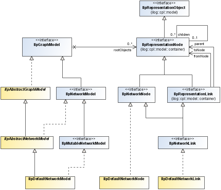 Representation objects to be added to the model must implement the IlpNetworkNode or IlpNetworkLink interface. Concrete implementations of these interfaces are provided as IlpDefaultNetworkNode and IlpDefaultNetworkLink. You can create subclasses of these representation object classes.