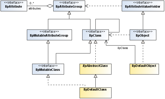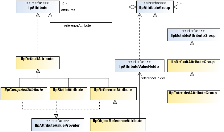 Attributes are logically gathered in attribute groups. An attribute group can be static or dynamic. Static attribute groups are defined by the interface IlpAttributeGroup and dynamic attribute groups are defined by IlpMutableAttributeGroup.