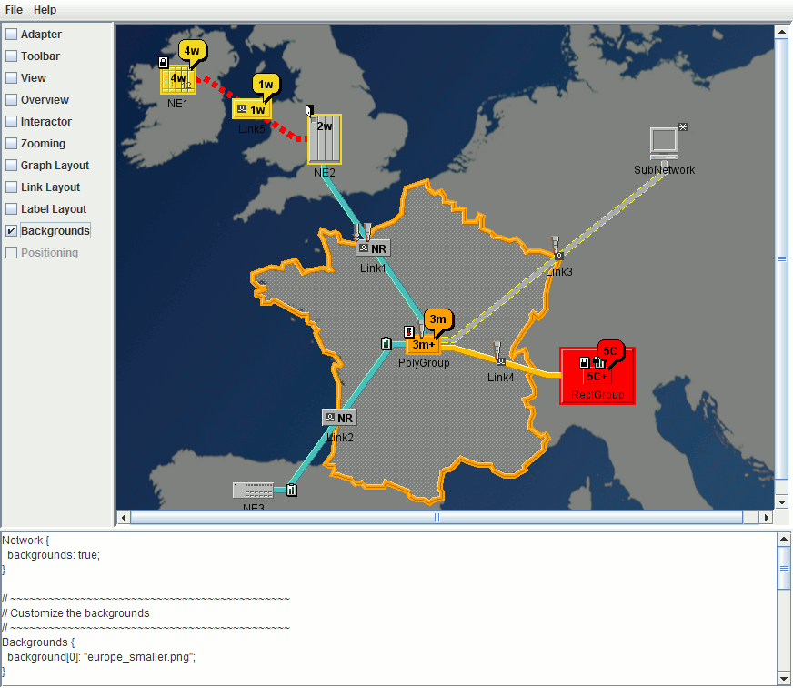 You need to create a new instance of a network and make sure that the appropriate configuration is assigned. The network configuration is normally read in from a CSS file. You ensure that the network configuration file is taken into account and parsed by passing the URL and context or, as in the example, by passing the filename and context as arguments of IlpNetwork. You then add the network component to the frame.