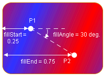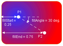 In LINEAR_GRADIENT and RADIAL_GRADIENT modes, the fillStart, fillEnd, and fillAngle properties define the geometry of the gradient. A gradient is defined by two points, P1 and P2. The following figures show the results of the properties.
