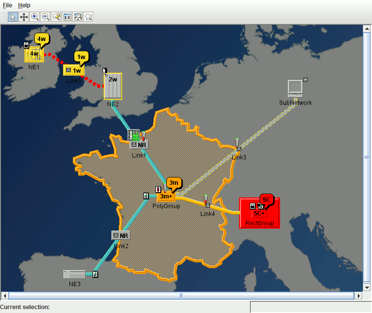 The network component supports editing, navigation, automatic layout of nodes and links, and background maps (for geographical displays). It can display all kinds of JViews TGO objects: network elements, links, groups, polylines, off-page connectors, cards, card carriers, shelves, ports, LEDs.