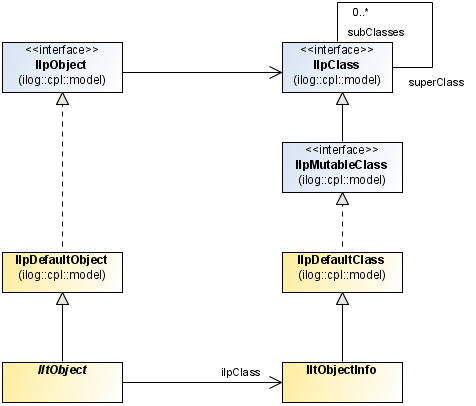 Predefined business object classes are subclasses of IltObject, which is itself a subclass of IlpDefaultObject. For each class deriving from IltObject, there is an instance of IltObjectInfo that is a subclass of IlpDefaultClass.