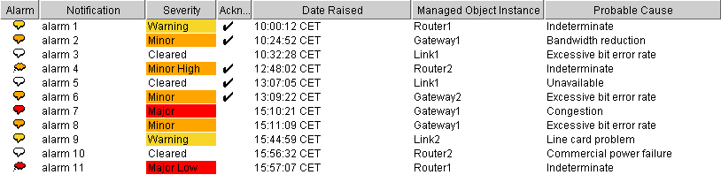 In the table component, each alarm object is represented as a row, with columns corresponding to attributes of the alarm object. The graphicalRepresentation attribute displays raw alarms with a tiny round rectangle alarm balloon, and impact alarms with a tiny alarm cloud. See the following figure.