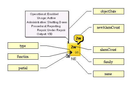 The grapic representation of the network element and the decorations added to it are based on the information that is available in the business model. Each decoration that is created depends on an attribute and on properties that can be customized through CSS. Symbolic network element with attributes shows a symbolic network element with the following attribute set: