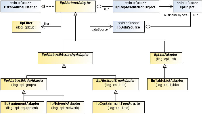 The adapter is an object that acts like a bridge between a data source and a graphic component. It converts the business objects of the data source ( IlpObject instances), which are component-independent, to representation objects which are suitable for a given representation model, that is, for a given graphic component. For information about the representation model and representation objects, see The representation model.