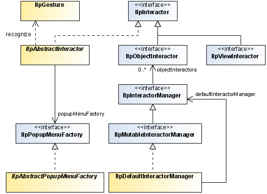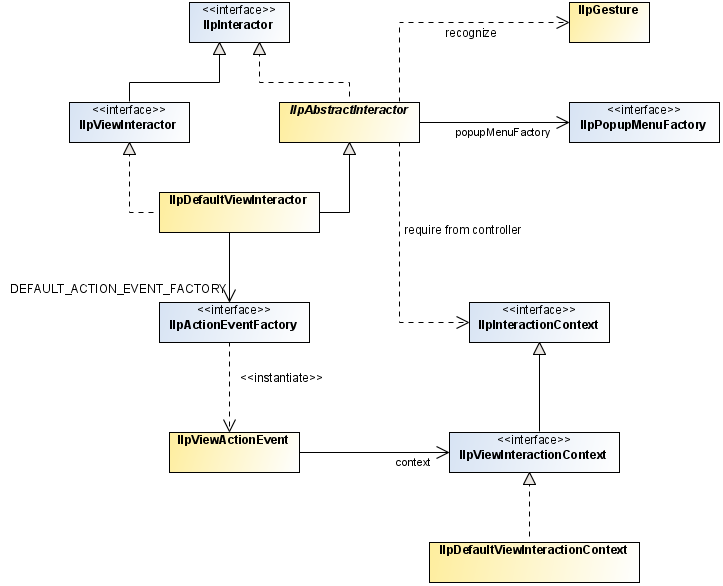 The interface IlpInteractor contains methods to attach keystrokes or user gestures to actions and to set a pop-up menu factory to the interactor.