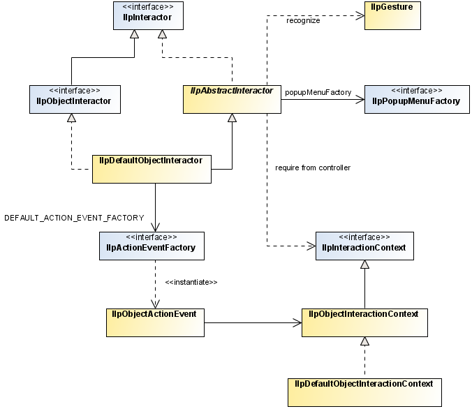 A default implementation is provided for the object interactor, which is defined by the class IlpDefaultObjectInteractor. The default object interactor provides an IlpObjectActionEvent that gives access to information contained in the object interactor context to the action that is called when a user gesture is recognized.