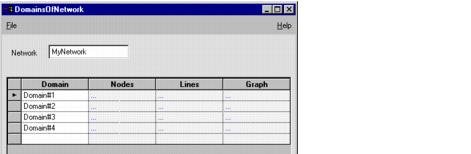 A table that represents a network with its main components, that is, domains. Dots appearing in the table cells are hyper-references. Double-clicking on a hyper-reference opens the view related to the pointed object.