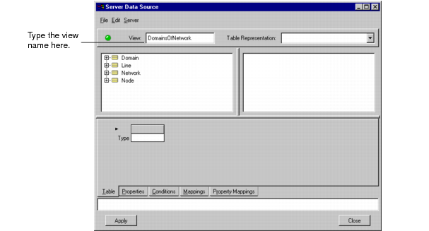 The name of the view appears underneath the Server Data Source icon in the Main window. If it does not, click on the icon to select it and type the name of the view again.