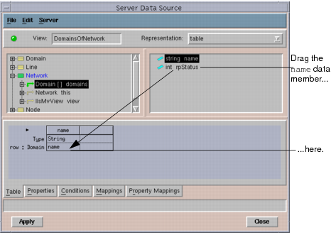 The Main data source table is composed of two kinds of representation objects: the table itself, and its associated rows. In this example, the table represents a network and the rows represent the domains owned by the network.