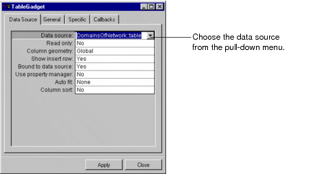 4. Use the combo box to select DomainsOfNetwork::domainTable in the Data Source cell of the Table Gadget inspector.