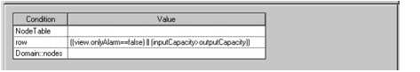 To filter the nodes that appear in the DomainNodes panel and show only those that are in an alarm state, you have to associate the condition (inputCapacity>outputCapacity) with their representation object, that is, with a row.