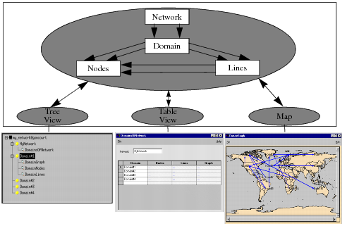 For example, to create a map as a representation of a domain, notification will propagate along the nodes and lines relations within this domain. Each node in the domain will be associated with a dot on the map, and each line with a connector. In addition, the propagation will extend to all lines in the domain that use this node as input or output. Finally, to ensure that no connector on the map has a loose end, propagation will also extend to the input and output relations for the lines represented.