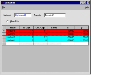 A table that represents the nodes of a given network domain with their input and output capacities, a hyper-reference to the Lines of Node panel, and two variables