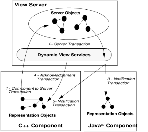 3. If all the editing operations involved are successful, the server object transaction is committed and a notification phase is performed by the server. Each component for which a view is opened on the modified server objects is notified about the resulting representation updates.