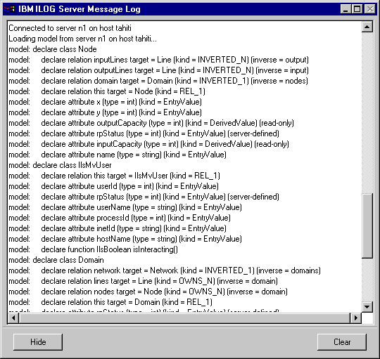 The lines in the log that start with model: show what was received from the server. In the example above, we can see that the class Node was declared and that it contains an attribute called x which is an IlsEntry object of type int. Using this trace, you can debug your macros to be sure that the model is correctly declared to the model interpreter.