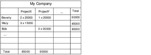 A matrix (or table): The participation of the employees of the company in all ongoing projects with their related costs.