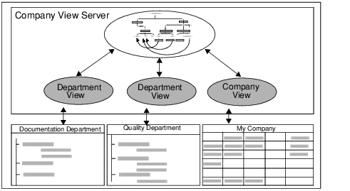 View types and the object model interact through a view server (see its definition in “View Server”). Figure 7.5 illustrates the Company view server, which is made up of an instance of our object model and a group of views.