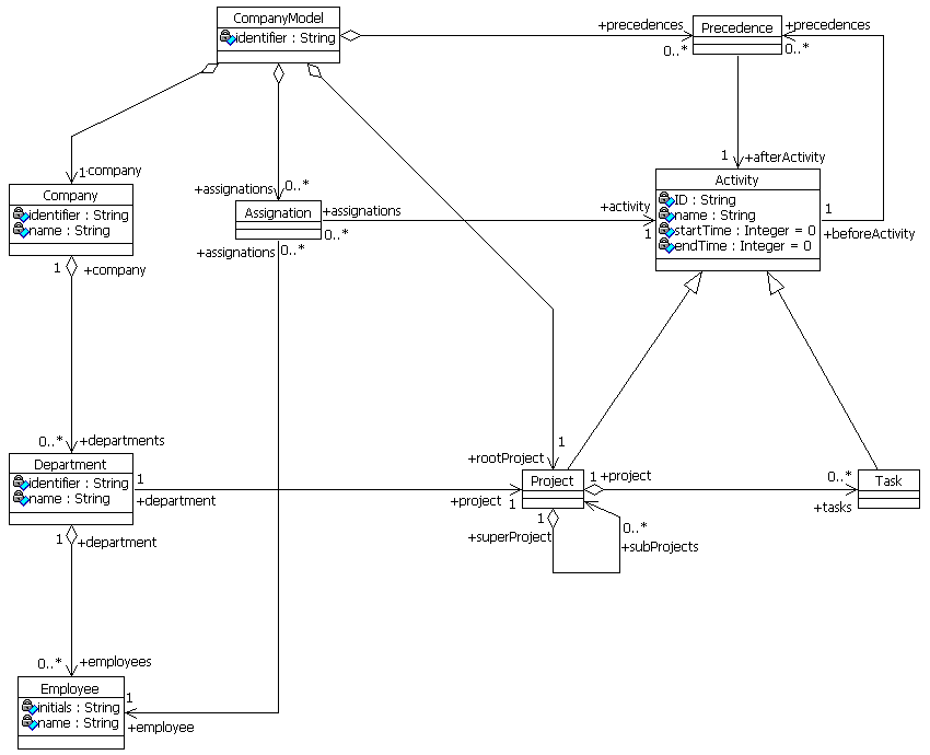 Let us define a dynamic business model to manage the projects of a company. This company is organized into departments with employees. Projects are organized hierarchically starting from a main project called rootProject. Each project is assigned to a department, and is composed of tasks. These tasks or projects are viewed as activities. The activities are assigned to employees and they are ordered with a precedence relation.