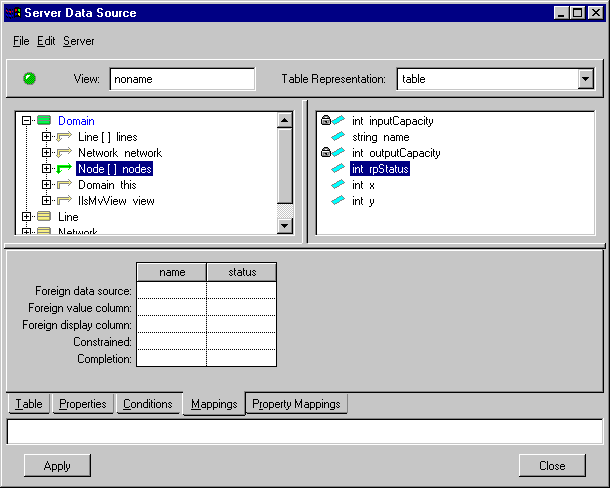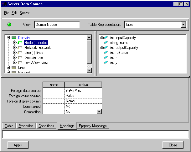 The Server Data Source inspector provides two notebook pages that can be used to map the Main table (Mappings page) and the Properties table (Property Mappings page). The mechanism used to map the foreign data source is the same for both tables. The Server Data Source inspector will create columns in the mapping pages for each column in the appropriate table.