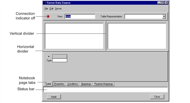 The bottom pane is divided into five notebook pages. You bring any page to the front by clicking on its name tab. This is where you drag the server classes you want to map to a graphic representation through a view.