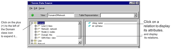 Description of the Model in the Server Data Source InspectorThe Network object model appears as a tree gadget in the top left section of the Server Data Source inspector. Classes in the model are represented by rectangular icons and are preceded by a plus (+) sign. Clicking on a class name or on its icon displays the related entry data members and derived data members in the top right pane of the inspector. A lock icon to the left of a class data member means that the data member is read-only.