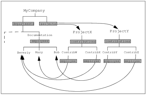In our example, the object model includes companies that take part in projects. A company is composed of several departments, each employing a number of people who contribute to the projects. Each department has a manager. A manager is a specific kind of employee. Employees, employee contributions and projects have a cost, which is calculated as follows: