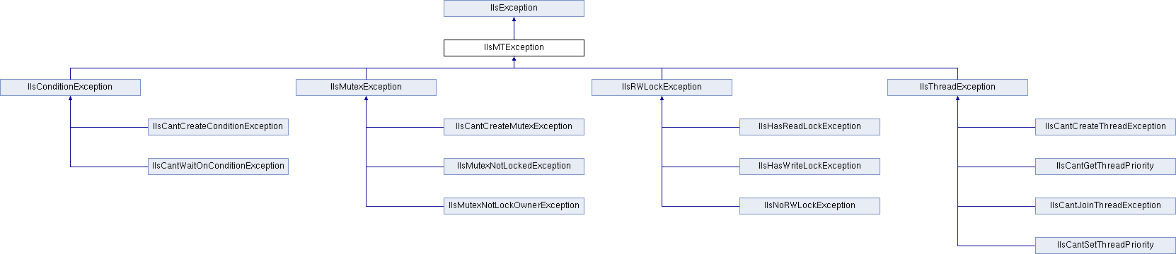 IlsException IlsConditionException IlsMutexException IlsRWLockException IlsThreadException IlsCantCreateConditionException IlsCantWaitOnConditionException IlsCantCreateMutexException IlsMutexNotLockedException IlsMutexNotLockOwnerException IlsHasReadLockException IlsHasWriteLockException IlsNoRWLockException IlsCantCreateThreadException IlsCantGetThreadPriority IlsCantJoinThreadException IlsCantSetThreadPriority