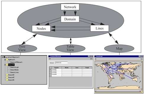 For example, to create a map as a representation of a domain, notification will propagate along the nodes and lines relations within this domain. Each node in the domain will be associated with a dot on the map, and each line with a connector. In addition, the propagation will extend to all lines in the domain that use this node as input or output. Finally, to ensure that no connector on the map has a loose end, propagation will also extend to the input and output relations for the lines represented.