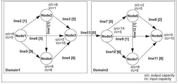 The diagram below illustrates an instance of the Network object model. The figure between brackets following the line number (for example, line3 [5]) is the line capacity.