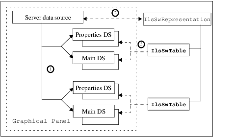 Connection between Views data sources and table representation objects (instances of the class IlsSwTable) is established when those table representation objects are created. Each table representation object retrieves its set of Views data sources through the Server data source using its own name.