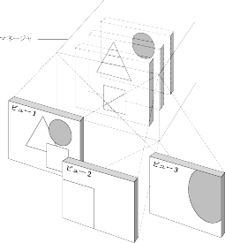 マネージャーを使うと、オブジェクト・セットを別々のビューに表示できます。マネージャーはレイヤー化を制御するため、表示や振る舞いの目的でオブジェクトを特定のレイヤーに割り当てることができます。各レイヤーは、マネージャーに制御されている各ビューで表示または非表示に設定できます。