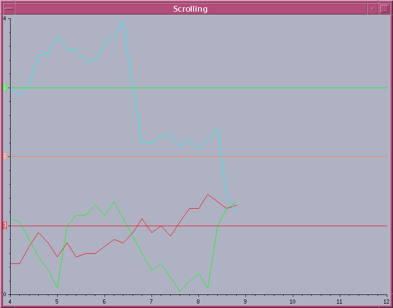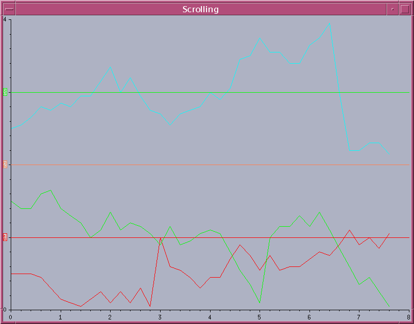 The complete source code for this example can be found in the scroll1.cpp file located in the $ILVHOME/samples/charts/userman/src directory. This section describes only the steps required to use the scroll modes to display data coming on the fly.
