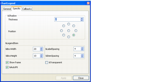 The General and Callbacks pages pertain to graphic objects in general while the Specific page contains specific settings for the chart legend object. You will use the Specific page to customize the layout of a given chart legend.
