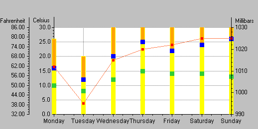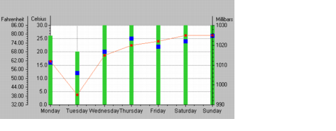 You have now completed the Cartesian chart example representing temperatures (cumulated or not) both on a Celsius scale and on a Fahrenheit scale, as well as pressures on a millibars scale. In working through this example, you have learned how to do the following: